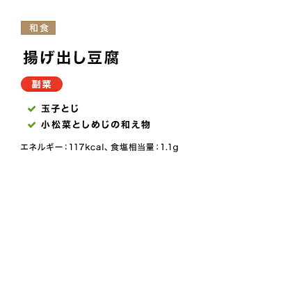 ■揚げ出し豆腐 1)名称(一般的名称) 冷凍食品 2)原材料名 揚げ出し豆腐[揚げ出し豆腐(小麦・大豆を含む)、だし(乳成分を含む)、大根、人参、その他(小麦・大豆を含む)]、玉子とじ[千草焼(卵・大豆を含む)]、小松菜としめじの和え物[小松菜、しめじ、その他(小麦・大豆・乳成分を含む)]/着色料(カロテノイド)、増粘剤(加工澱粉)、酸化防止剤(V.C)、pH調整剤、調味料(アミノ酸等)、豆腐用凝固剤、塩化Mg 3)内容量 揚げ出し豆腐+2種 4)賞味期限 別途ラベルに記載 5)保存方法 要冷凍(−18℃以下で保存のこと) 6)製造者または販売者 株式会社ジョイント 大阪府松原市 ■白身魚の漬け焼き 1)名称(一般的名称) 冷凍食品 2)原材料名 白身魚の漬け焼き[シルバー、さやえんどう、みりん、うすくちしょうゆ(小麦・大豆を含む)、その他]、さつま芋の煮物[だし(乳成分を含む)、さつま芋、その他(小麦・大豆を含む)]、切干大根[だし(乳成分を含む)、人参、切干大根、みりん、うすくちしょうゆ(小麦・大豆を含む)、その他]、ほうれん草のごま和え[ほうれん草、もやし、その他(乳成分・小麦・大豆・ごまを含む)]/調味料(アミノ酸等) 3)内容量 白身魚の漬け焼き+3種 4)賞味期限 別途ラベルに記載 5)保存方法 要冷凍(−18℃以下で保存のこと) 6)製造者または販売者 株式会社ジョイント 大阪府松原市 ■トマトチーズオムレツ 1)名称(一般的名称) 冷凍食品 2)原材料名 トマトチーズオムレツ[オムレツ(卵・小麦・大豆を含む)、ブロッコリー、玉葱、ナチュラルチーズ(乳成分を含む)、その他]、ミックスサラダ[キャベツ、ミックスベジタブル、イタリアンドレッシング(小麦・豚肉・大豆を含む)、その他]/増粘剤(キサンタンガム)、調味料(アミノ酸等) 3)内容量 トマトチーズオムレツ+1種 4)賞味期限 別途ラベルに記載 5)保存方法 要冷凍(−18℃以下で保存のこと) 6)製造者または販売者 株式会社ジョイント 大阪府松原市 ■ジャーマンポテト 1)名称(一般的名称) 冷凍食品 2)原材料名 ジャーマンポテト[じゃが芋、玉葱、ウインナー(牛肉・豚肉・鶏肉・ゼラチン・大豆を含む)、ベーコン(卵・乳成分・豚肉・大豆を含む)、その他(乳成分を含む)]、キャベツのカレーソテー[キャベツ、赤ピーマン、黄ピーマン、こいくちしょうゆ(小麦・大豆を含む)、その他(乳成分・小麦・豚肉・鶏肉・大豆を含む)]/着色料(コチニール色素)、保存料(ソルビン酸K)、増粘剤(加工澱粉、増粘多糖類)、酸化防止剤(V.C)、発色剤(亜硝酸Na)、pH調整剤、香料、酸味料、調味料(アミノ酸等)、リン酸Na 3)内容量 ジャーマンポテト+1種 4)賞味期限 別途ラベルに記載 5)保存方法 要冷凍(−18℃以下で保存のこと) 6)製造者または販売者 株式会社ジョイント 大阪府松原市 ■あじのごま味噌焼き 1)名称(一般的名称) 冷凍食品 2)原材料名 あじのごま味噌焼き[あじ、米みそ(大豆を含む)、その他(ごまを含む)]、キャベツの味噌和え[キャベツ、黄ピーマン、赤ピーマン、その他(大豆・乳成分を含む)]、青梗菜とマカロニの和え物[チンゲン菜、マカロニ(小麦を含む)、人参、その他(小麦・大豆を含む)]/保存料(酒精)、調味料(アミノ酸 3)内容量 あじのごま味噌焼き+2種 4)賞味期限 別途ラベルに記載 5)保存方法 要冷凍(−18℃以下で保存のこと) 6)製造者または販売者 株式会社ジョイント 大阪府松原市